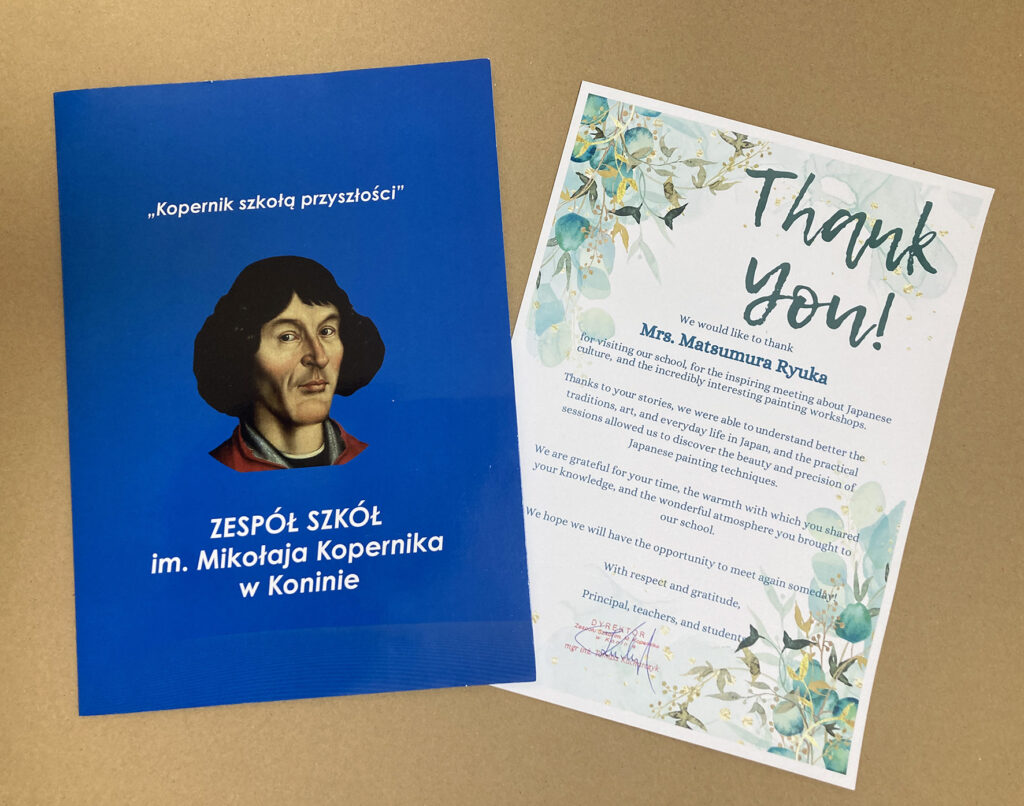 10月29日。ポーランドのコニン市にあるコペルニクス総合高校で授業として水墨画ワークショップをした際、校長先生より感謝状を頂きました。準備に奔走して頂いたアルトル先生をはじめ先生方には大変お世話になりありがとうございました。