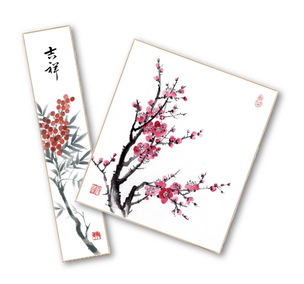 墨で絵を描き、濃淡、ぼかし、かすれ、にじみなど墨の豊かな表現にふれるワークショップです。今回は、迎春にふさわしい縁起の良いモチーフ「南天」または「紅梅」をテーマに、色紙に描く水墨画ワークショップを開催します。初めての方も大歓迎。お手本をご用意しておりますので、安心してご参加ください。完成した作品は、短冊掛仕立てや色紙掛仕立てにしてお持ち帰りいただけます。お正月の室礼(しつらい)として、ご自宅で飾っていただけます。