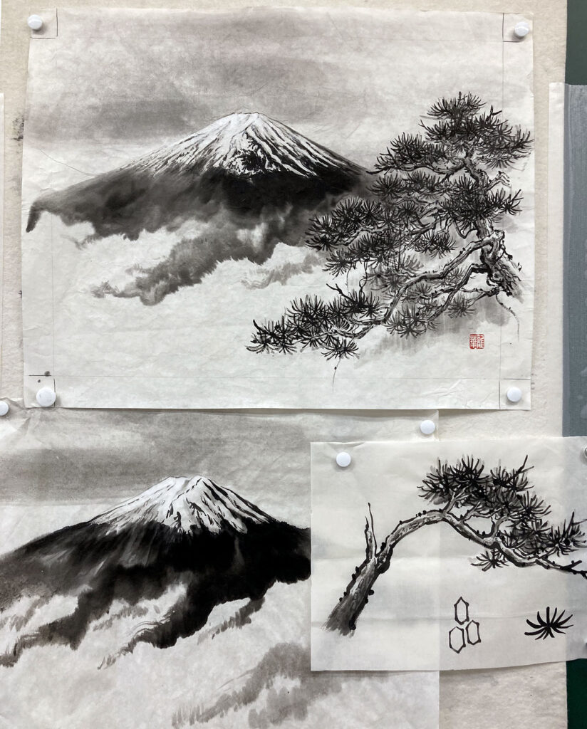 水墨画で描く富士山と松。(御代志教室)